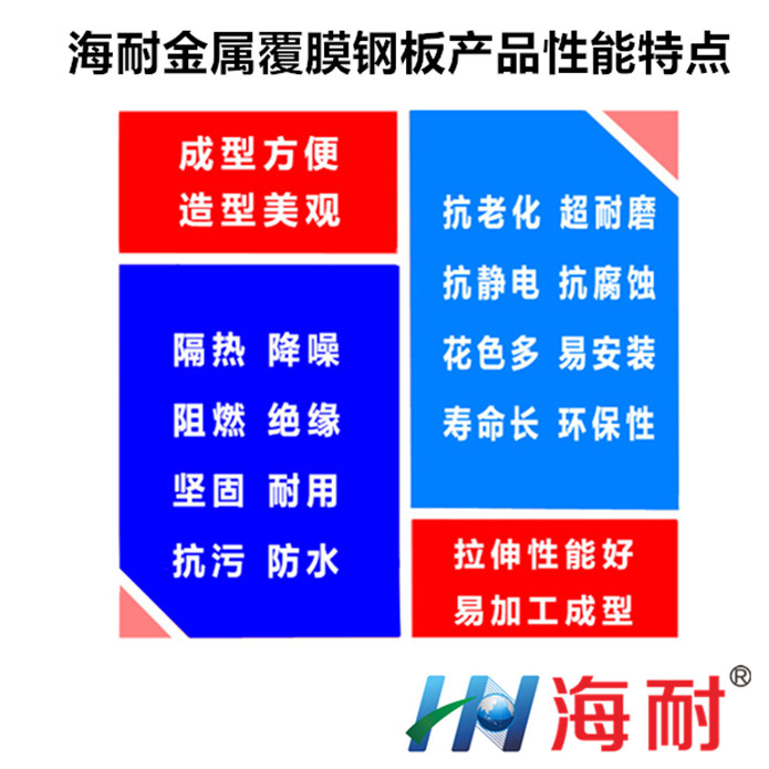 海耐金屬覆膜鋼板是在金屬基材上面覆了一層膜。用高光膜或幻彩膜、耐候膜、隔熱膜。經高分子膠膜熱壓覆合而成。金屬覆膜板光澤鮮艷,可挑選花色品種多,防水、防火,具有優良的耐久性(耐候性、耐蝕性、耐化學性)和抗污能力,防紫外線性能優越。海耐金屬覆膜鋼板(咨詢:0510-83326008)的材質和厚度也不同。高分子納米覆膜是一種新式覆膜工藝,一層膜一層金屬板經過高溫高壓壓合而成。